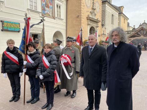 Lucjan Michalik oraz uczniowski poczet sztandarowy (