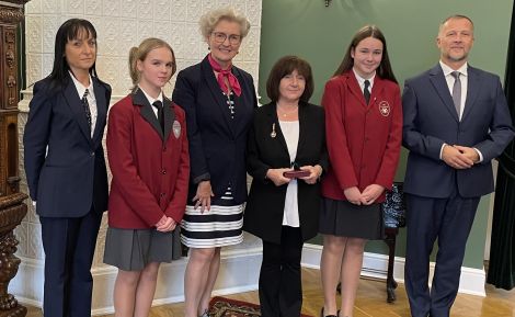 Danuta Kocoń, zastępca dyrektora szkoły oraz uczennice kl. VIII B
