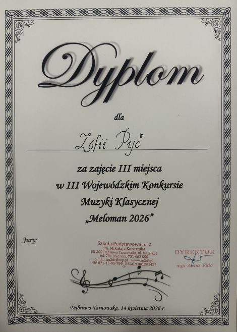 zajęła 3. miejsce w Wojewódzkim Konkursie "Meloman" poświęconym historii muzyki. Opieka naukowa: