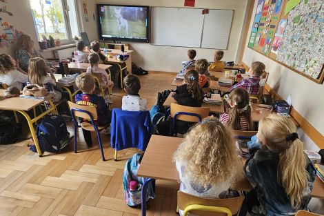 W dniu szkolnego kiermaszu na rzecz bezdomnych zwierząt kl. II miała okazję posłuchać o pracy w Stowarzyszeniu Dog Rescue oraz opiece nad psami i kotami będącymi podopiecznymi stowarzyszenia (narrator: Katarzyna Giza-Szpakowicz).
